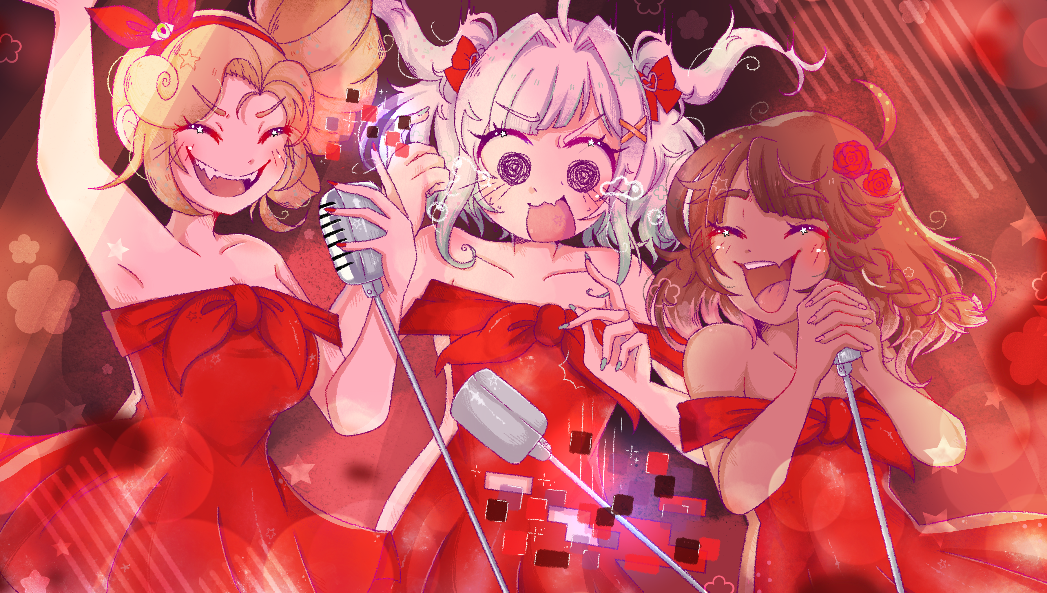 todays artwork is a lovely piece of the densetsu.exe girls featuring Mint's legendary red dress! this comes from an older karaoke stream that minto did where she used a red dress asset for her vtuber model, but it was attached . . . not so securely !! hence why the dresses in the artwork are slightly off! vicky is using her magic to slowly pixel away mint's dress, i thought this would be a super cute idea !!